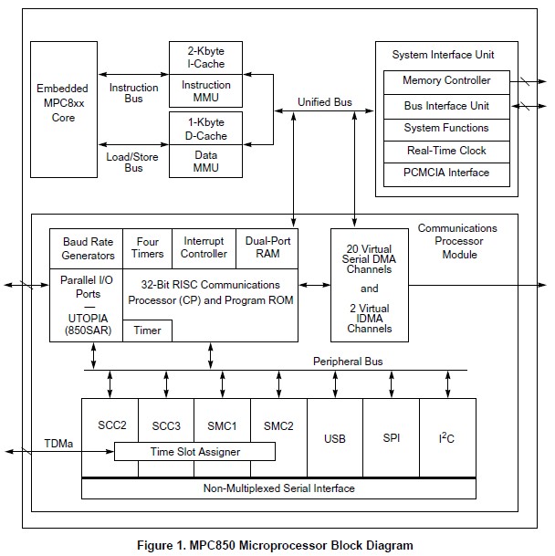 Features: (1)Embedded single-issue, 32-bit MPC8xx core (implementing the PowerPC architecture) with thirty-two 32-bit general-purpose registers (GPRs); (2)Advanced on-chip emulation debug mode; (3)Data bus dynamic bus sizing for 8, 16, and 32-bit buses; (4)Completely static design (00 MHz operation); (5)System integration unit (SIU); (6)Four independent baud-rate generators (BRGs): Can be connected to any SCC, SMC, or USB; Allow changes during operation; Autobaud support option; (7)Two SCCs (serial communications controllers); (8)Low-power support.
